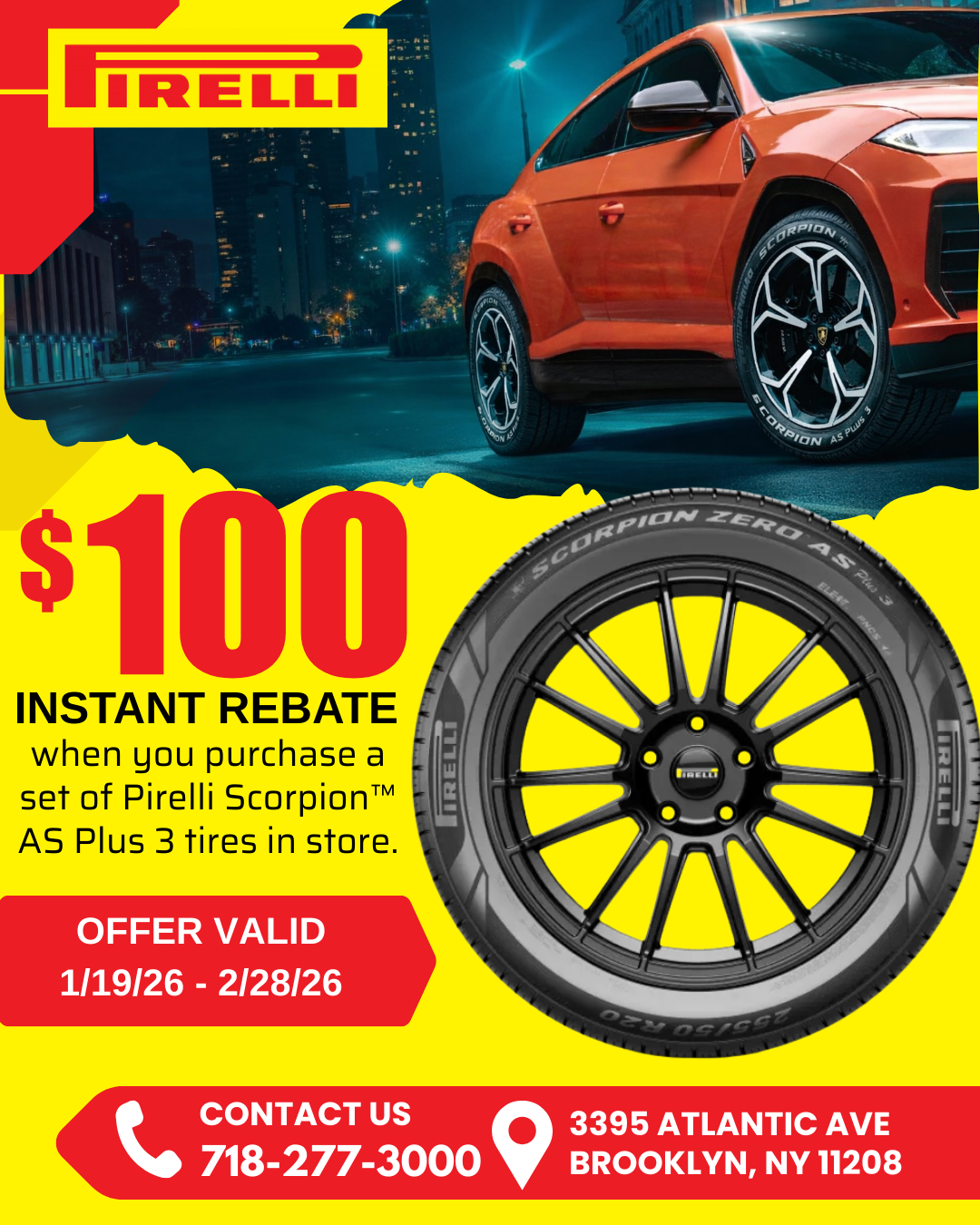 Get a $100 Instant Rebate when you purchase a set of Pirelli Scorpion™ AS Plus 3 tires in store.