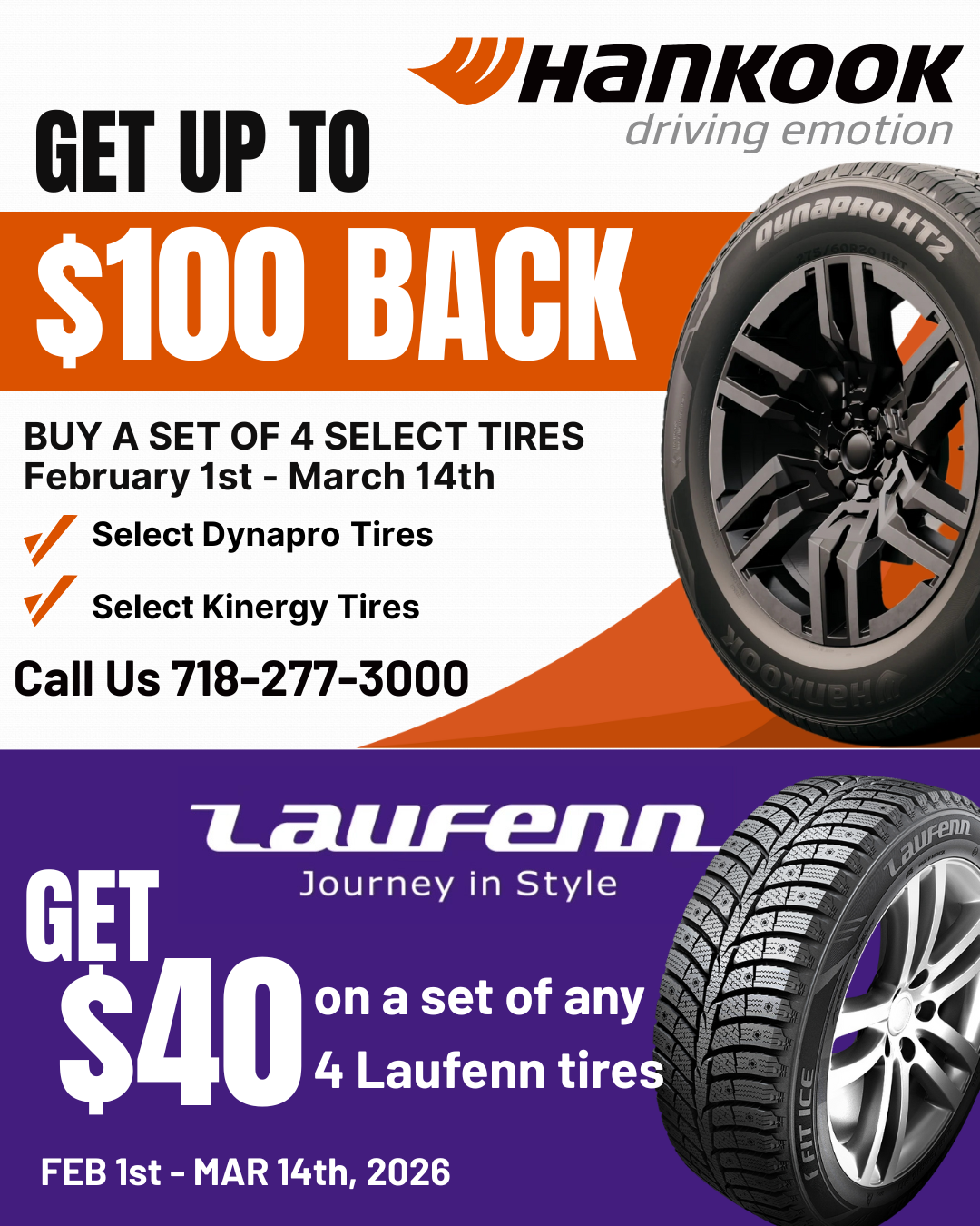 Buy A Set of 4 Select Tires – Dynapro Tires or Kinergy Tires. We are also offering $40 off on a set of any 4 Laufenn tires.